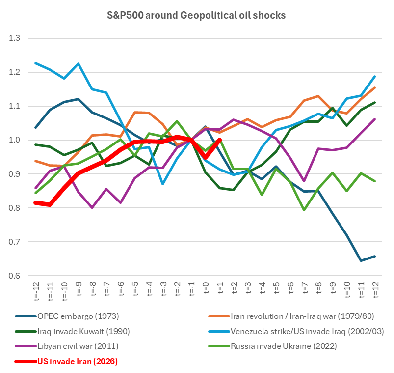 But for equity investors, a second question matters just as much: do geopolitical oil price shocks cause equity bear markets? The S&P500 behaviour around geopolitical oil shocks tell a more complicated story.